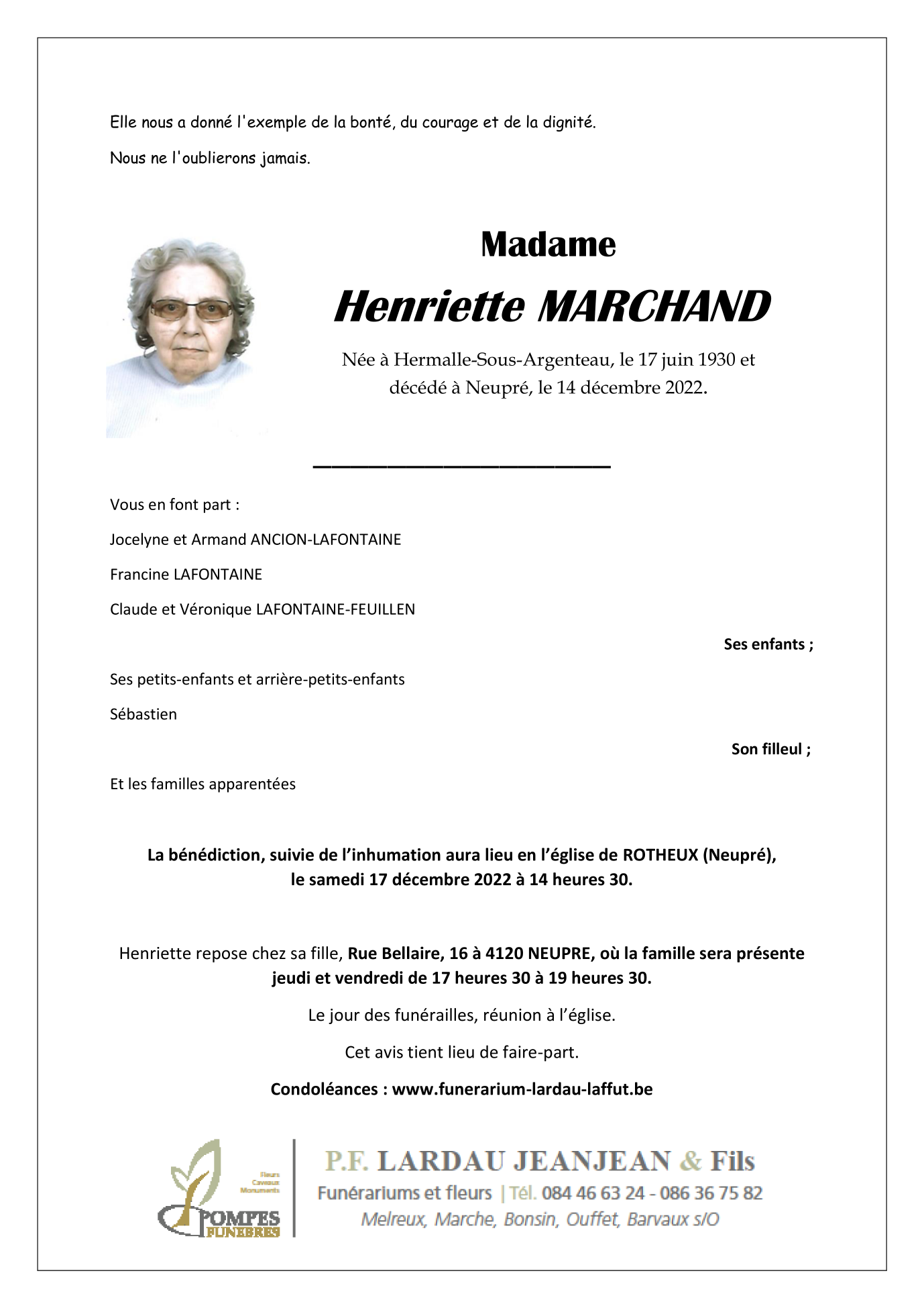 Décédée à Neupré (4120) le mercredi 14 décembre 2022 à l'âge de 92 ans